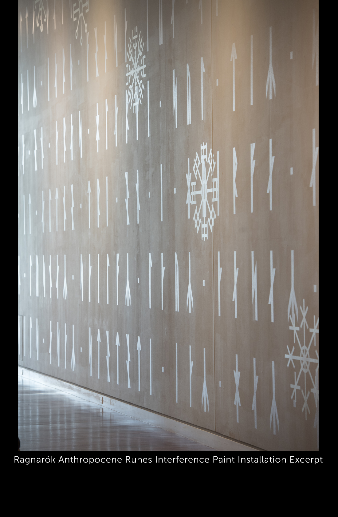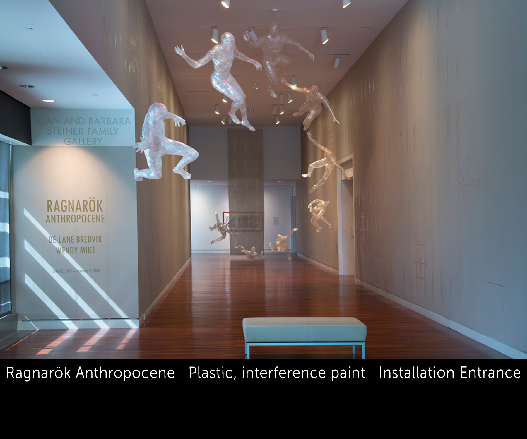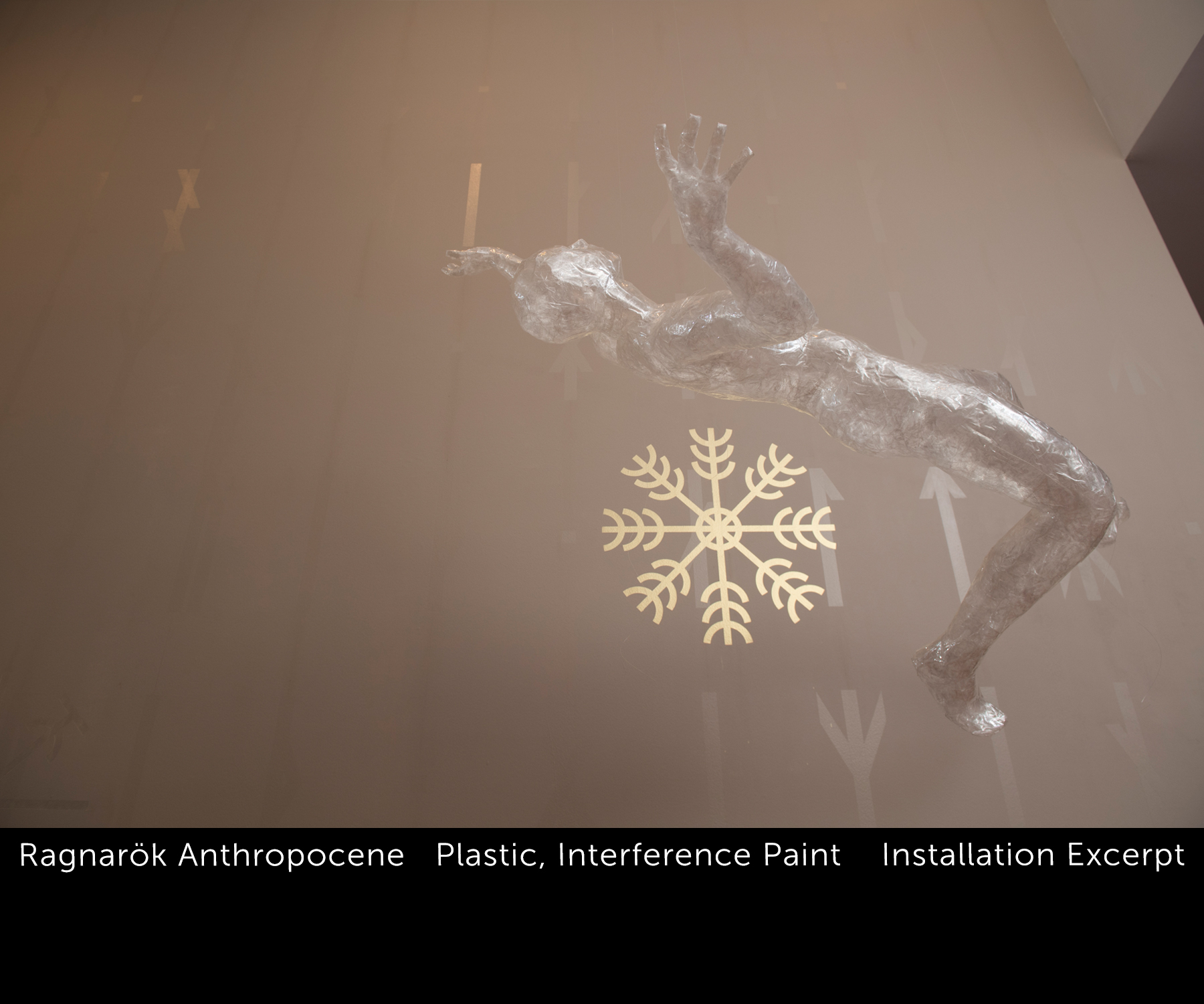 Ragnarök/Anthropocene was a collaborative installation I did with De Lane Bredvik at the Colorado Springs Fine Arts Center. Using imagery and poetry from the Scandinavian myth, we drew attention to our current epoch, the Anthropocene, to raise questions about our responsibilities to our planet and each other. The gods of the Ragnarök story were depicted as translucent forms floating in a field circumscribed by the tale itself written in ancient runes on the walls, that appeared and disappeared as the viewer walked through the exhibit. Also on the walls were “galdrastifir,” protective symbols placed coincidentally with the position of the gods, whose postures imagine them in battlle with the unseen giants of the myth.