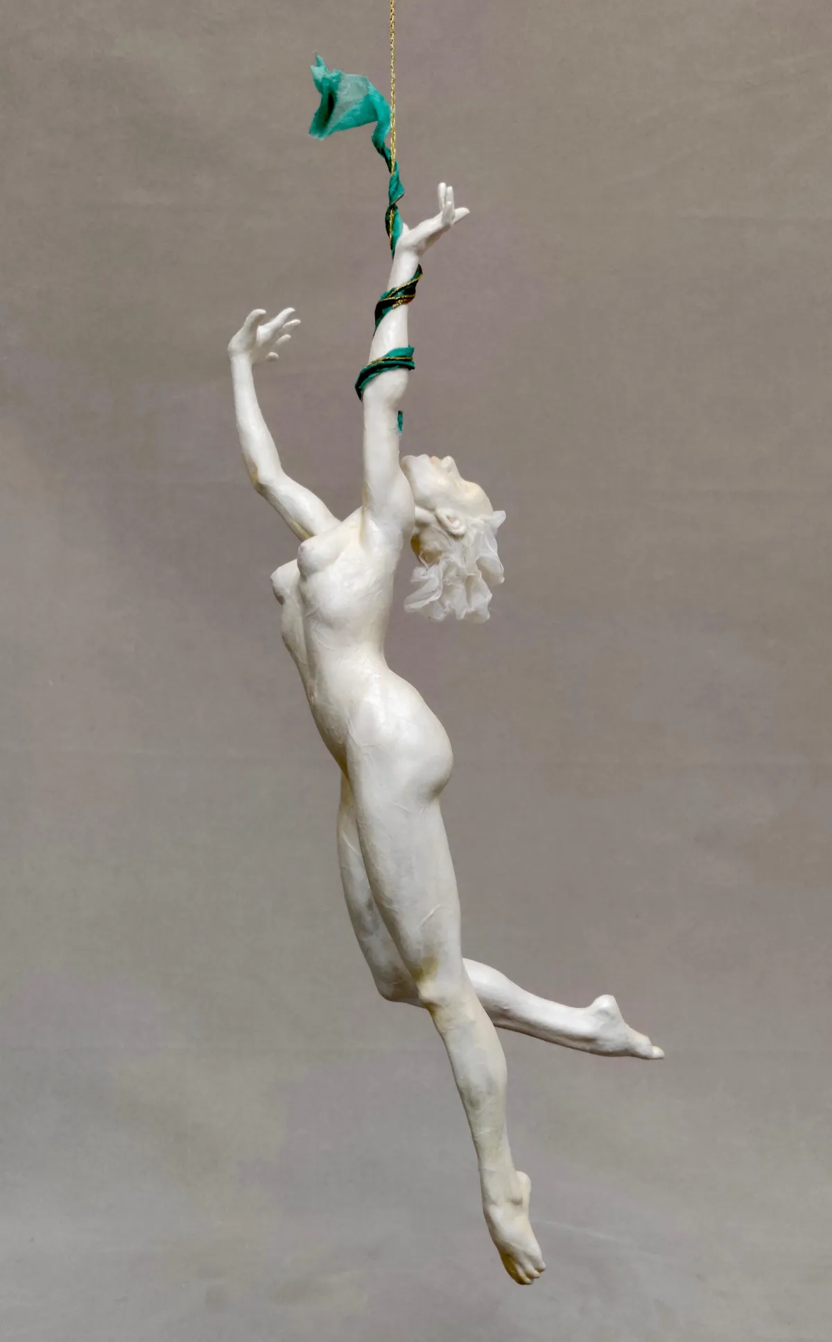 The materials I choose are lightweight. Fabric, paper, wire, thread, tape, super-fine doll maker’s clay – all used in such a way as to capture the essence of this journey of motion. Often the work is hollow, supplying two palettes with which to work: the inner palette, that which can be seen from the outside but describes the inner space, and the outer palette: that which wraps the figure, cloaking it in the skin that is most immediately seen.
