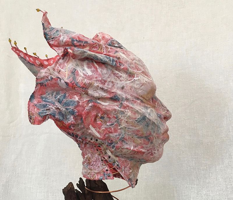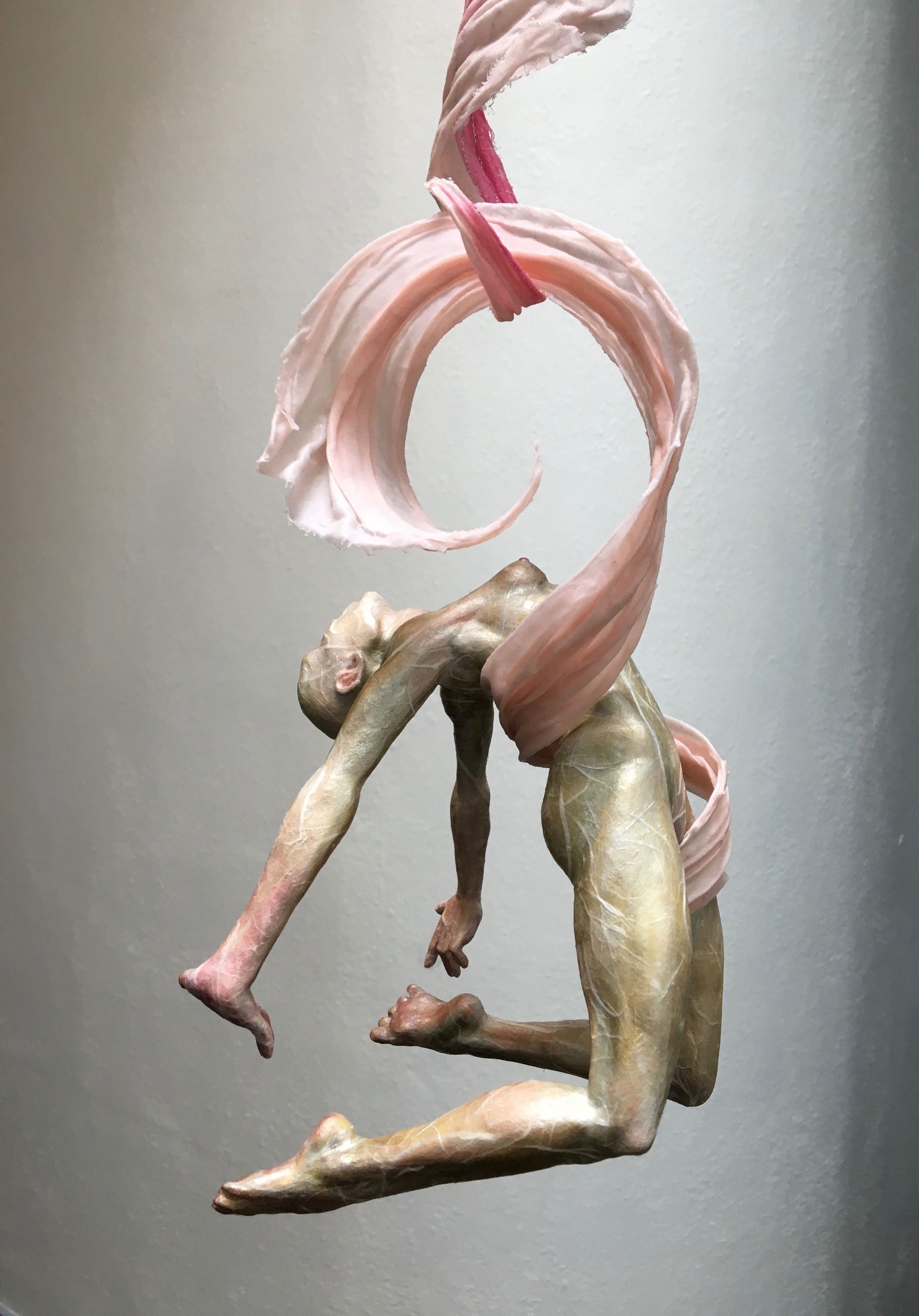 The materials I choose are lightweight. Fabric, paper, wire, thread, tape, super-fine doll maker’s clay – all used in such a way as to capture the essence of this journey of motion. Often the work is hollow, supplying two palettes with which to work: the inner palette, that which can be seen from the outside but describes the inner space, and the outer palette: that which wraps the figure, cloaking it in the skin that is most immediately seen.