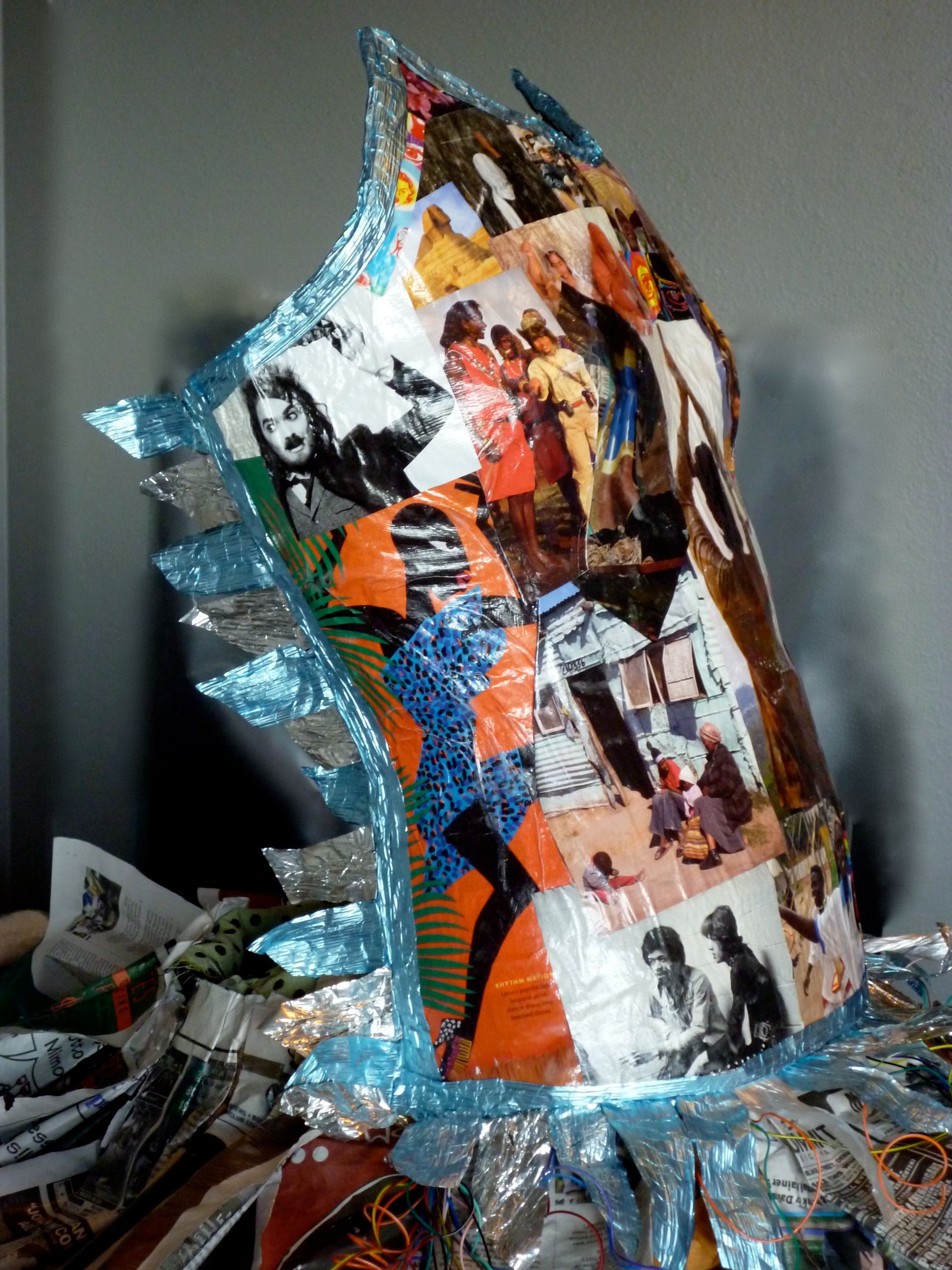 This benefit for Trails and Open Space specified that 80% of the entries be made from recycled materials. A group of us from Core Power Yoga studio collaborated on a piece made from newspapers, magazines and electrical wire.